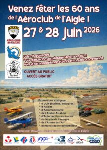 Portes Ouvertes des 60 ans de l’Aéroclub de l’Aigle Samedi 27 & dimanche 28 juin. Venez fêter nos 60 ans avec nous ! Entrée gratuite Au programme : vols découverte, initiation pilotage (avion & ULM), vol double commande, aéromodélisme, exposition avions, automobiles anciennes, musée de l’énergie, Armée de l’Air, démonstrations radioamateur. Inauguration de notre KIEBITZ …